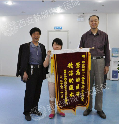 经张教授亲自主刀手术(“全安”疗法)后,马艳听力下降的症状也随之消失。手术后,马艳无右耳闷胀堵塞感,无听力下降、耳闷,无耳流脓,无耳痛,头晕、头痛等不适,家里人看到马艳痊愈特别感激。5月27日,为了感激张教授,马艳随同父亲不远千里,特意从榆林老家赶来西安中大耳鼻喉医院,与父亲一起亲自将锦旗送到张全安教授手中,称赞张教授“精湛的医术,崇高的医德”。