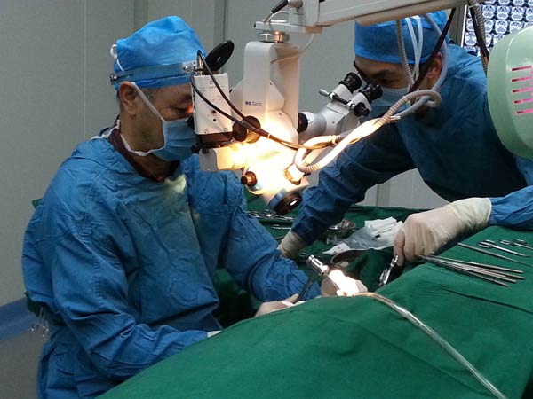 图为:西安中大张全安教授实施显微外科高难度手术